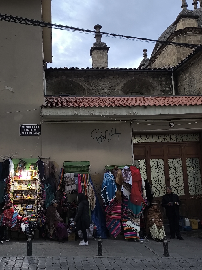 A street scene shows vendor stalls selling colorful textiles and goods. Two women are seated at their stands, with a customer browsing. A man stands nearby. The storefront behind them has a large wooden door with decorative ironwork. Above, a red-tiled roof and stone building with arched windows are visible. A sign reads "Monumento Nacional Prohibido Fijar Carteles." Graffiti is on the wall. The sky is overcast.