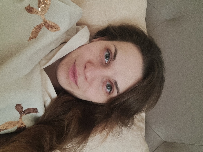 A woman with light skin and light eyes reclines, partially covered with a white hooded garment featuring gold-colored sequin designs. Brown hair falls around her face and onto a light-colored surface. The background includes a gray, textured surface suggestive of a headboard or wall. The image is taken from an angled, close-up perspective focusing on her face and upper body.