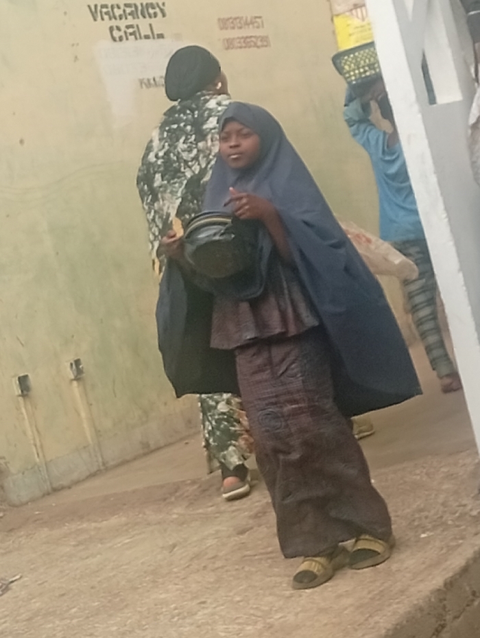 The scene depicts a street in the city of Maiburiji, Nigeria. In the foreground, a young female, approximately an adolescent, is shown from the waist up, facing slightly right and looking forward. She wears a dark blue head covering (khimar) and a dark patterned long dress or skirt, with open-toed sandals. She holds a dark, circular object resembling a small bowl or pot in her right hand, while her left hand is partially raised in a gesturing motion. Behind her and to the left, an adult female is seen from the back, wearing a black head covering and a camouflage-patterned long-sleeved garment, with open-toed shoes on her right foot. Further in the background on the right, partially obscured by a light-colored pillar, a third individual in a light blue shirt carries a woven basket on their head. The background features a light beige or off-white wall displaying the text "VACANCY CALL" and two phone numbers: "0813134451" and "0803335239". The ground is an uneven, light brown dirt or concrete surface.