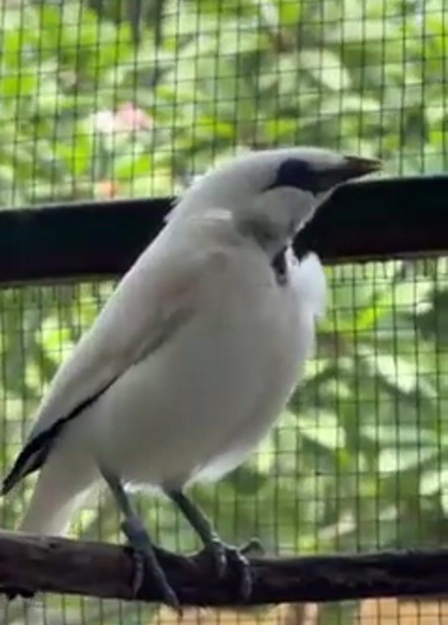 white bird with black markings perched on a branch inside a cage. The bird appears to be in a zoo or aviary setting, as there are trees visible through the mesh of the cage. The bird is the primary focus of the video.