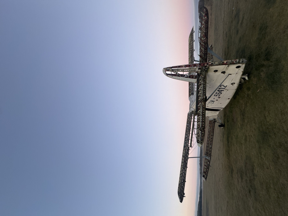 - "A dilapidated biplane stands in a grassy field under a sky transitioning from light blue to pastel pink" by FM-osXZC2, licensed under CC BY 4.0