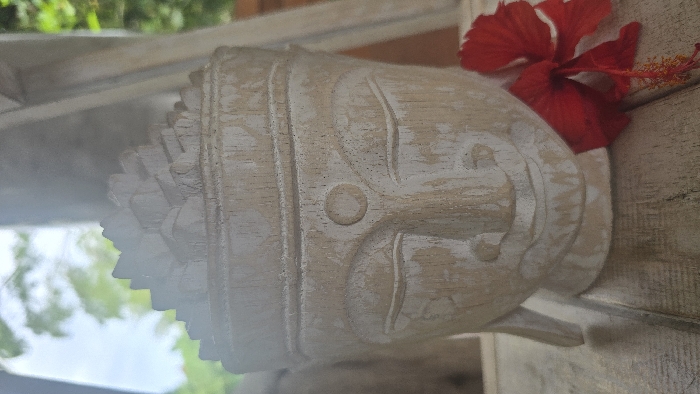 - "A weathered, wooden Buddha head rests on a wooden surface, adorned with a vibrant red hibiscus flower tucked behind the right ear" by FM-07oO12, licensed under CC BY 4.0