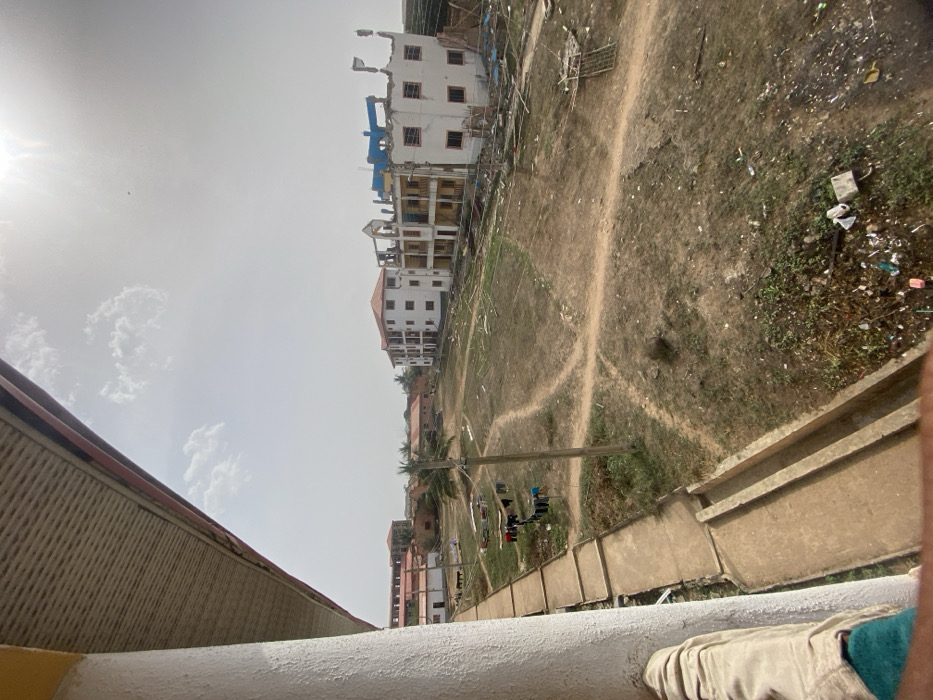 The image presents an elevated view of a dry, semi-urban landscape in Ipetumodu, Nigeria, under a bright, hazy sky with partial cloud cover. The perspective is from an upper floor or balcony, with a portion of a building's white column and roof overhang visible in the left foreground. A person's lower leg, clad in khaki fabric and a green sock, is present in the extreme lower-left corner. The central and foreground terrain consists of dry, light-brown earth with sparse vegetation, dissected by numerous unpaved dirt footpaths. Scattered refuse, including plastic containers and various debris, is visible across the ground, notably in the lower right. Along the left side of the scene, extending from the foreground, is a concrete pathway running parallel to a concrete drainage channel. Clothes are seen hanging on a line or frame in the mid-left, suggesting drying. A wooden utility pole with attached wires stands vertically in the center-left of the open field. In the mid-ground, multiple structures are present. To the left, a long, single-story building with a reddish-brown corrugated roof is visible. Further right, a complete, three-story white building with a reddish-brown roof and multiple windows stands next to an adjacent multi-story structure that appears to be under construction or partially demolished. This latter building features exposed concrete framing, some blue structural elements on its upper level, and incomplete or damaged white wall sections. Debris and rudimentary scaffolding are evident around its base. Additional buildings with reddish-brown roofs are discernible in the distant background.