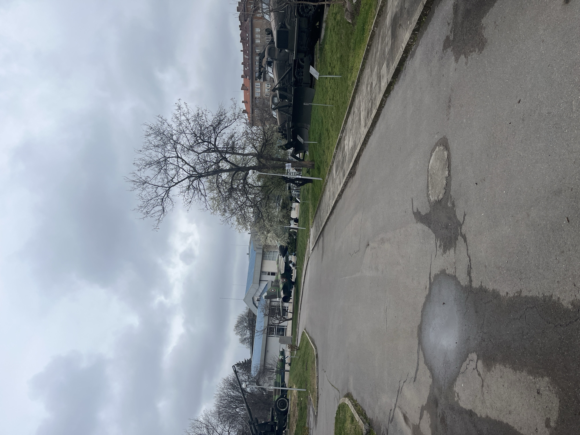 This image depicts an outdoor scene in Sofia, Bulgaria, likely within a museum or historical site. The foreground is dominated by an asphalt road with visible wear, including cracks and patches of water. Adjacent to the road, there's a raised concrete curb and a grassy area featuring several military vehicles and equipment displayed as exhibits. These include tanks, artillery pieces, and possibly aircraft. In the background, a building with a light blue roof and white walls can be seen. Behind the exhibits, there's a line of buildings with red roofs. A bare tree with intricate branches stands near the display, partly obscuring some of the exhibits. The sky is overcast with heavy clouds, suggesting a dull or rainy day.