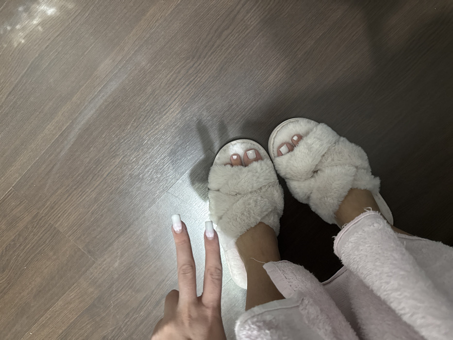 The image depicts a low-angle overhead view of a person's lower legs, feet, and one hand on a light brown laminate wood floor. The person is wearing light beige or cream-colored fuzzy criss-cross strap slippers. Their toenails are painted white. A light pink or beige towel-like fabric, possibly a robe, is visible on the person's left leg, with some loose threads or damage near the cuff. The person's left hand is extended into the frame from the upper left, making a "V" gesture (peace or victory sign) with the index and middle fingers. The fingernails on these fingers are long and shaped, with a white tip, indicating a French manicure style. The flooring shows a wood grain pattern and appears clean. The specific location within the city of Dobrich, Bulgaria, cannot be determined from the visual information provided in the image.