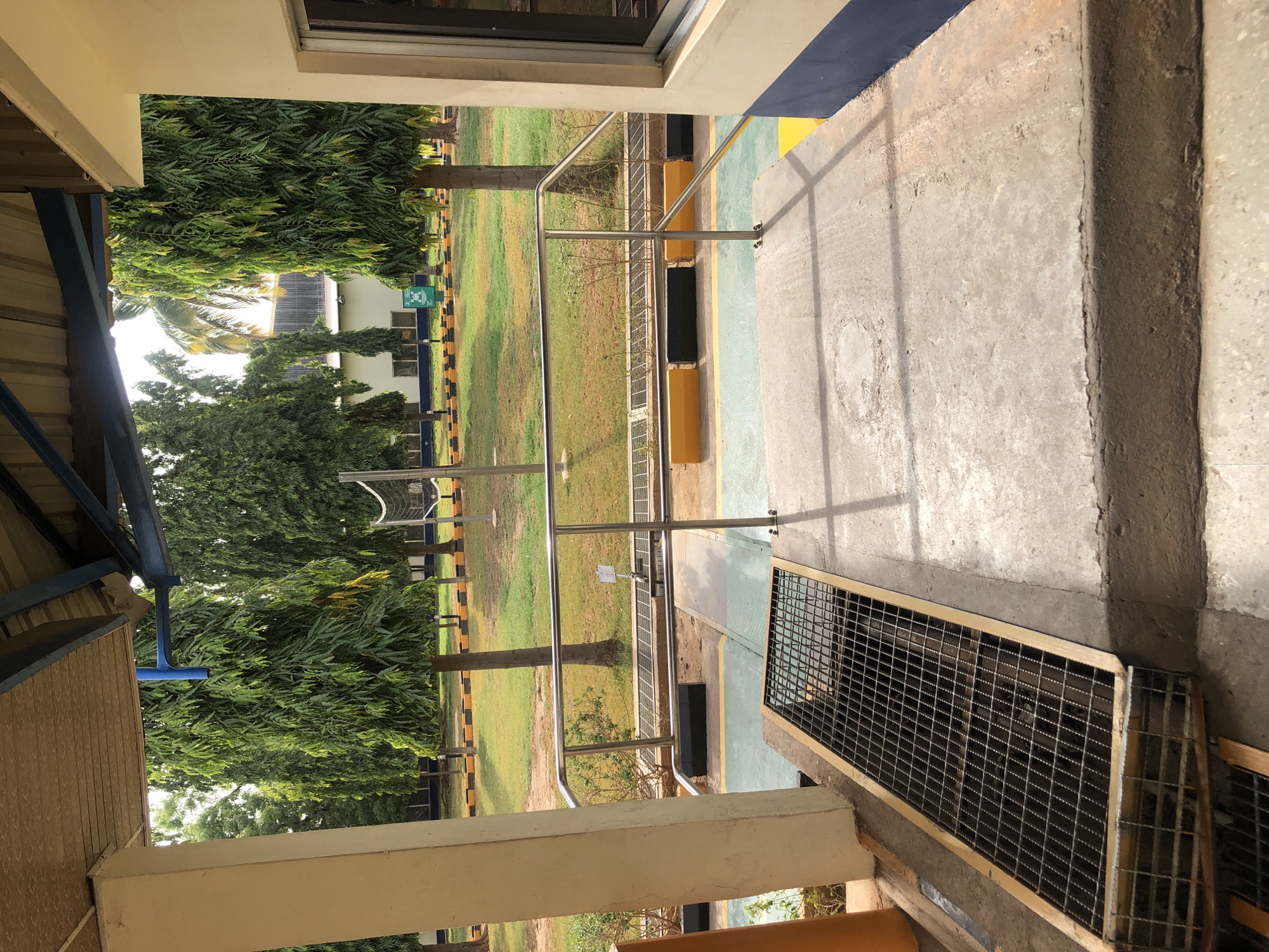 The image, taken in Sabon Gari Nassarawa, Nigeria, shows an outdoor scene viewed from under an architectural overhang. A fenced-in grassy area with mature trees is visible. The fence is painted with yellow and black stripes. In the foreground, a metal grate is positioned on a concrete platform. A stainless steel railing provides a barrier along the edge of the platform. The platform surface is painted in sections with yellow and light blue/green. The overhang is supported by a white pillar. A building with white walls is partially visible in the background.