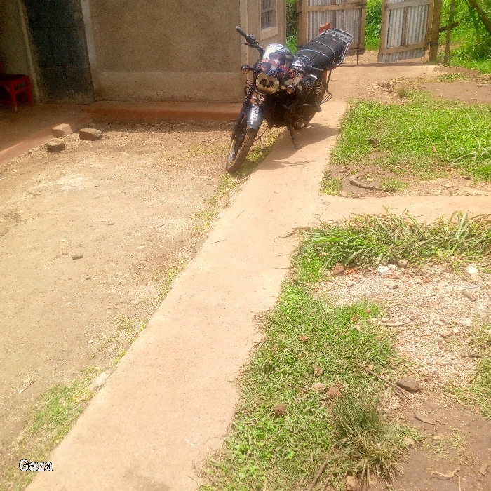 The scene, located in Bonyamaro ward, Kenya, depicts an outdoor environment under daylight conditions. A black motorcycle is centrally positioned, parked on a concrete walkway that bisects the frame diagonally from lower left to upper right. The motorcycle, resting on its kickstand, displays a patterned black seat and features visible headlights with decorative elements. To the left of the concrete path, a dirt and gravel ground surface leads to a light-colored, single-story building with a visible window. A red plastic chair and several loose red bricks are positioned near the building's base. To the right of the walkway, patches of green grass and scattered vegetation are present. In the background, an open gate constructed from corrugated metal is visible, with dense green foliage beyond it. No persons are present, and no active interactions or movements are observed.