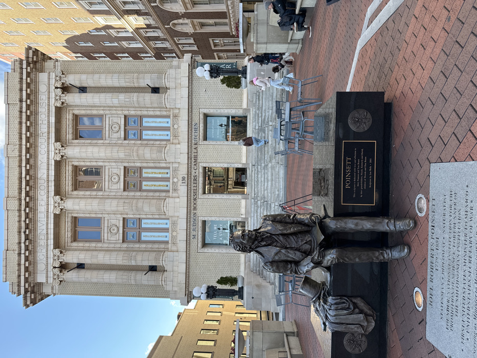 A bronze sculpture of Joel Roberts Poinsett sits on a black monument in front of Greenville County Courthouse at 130 M