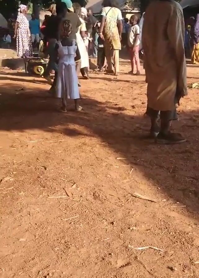 group of people gathered in an outdoor, open space. The ground is predominantly red dirt, with scattered vegetation. Several individuals, including children, are visible, dressed in a variety of clothing. Some of the people are moving, seemingly dancing or walking around, while others are standing or sitting. A young girl in a white dress stands out among the crowd. There are buildings and trees in the background, creating a village-like setting. Music or sound effects can be heard in the background. The camera moves slightly, offering different perspectives of the scene.