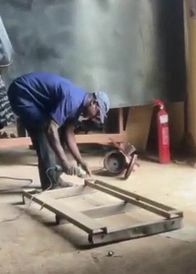 man in a blue shirt, dark pants, and a patterned cap using an angle grinder on a metal frame
