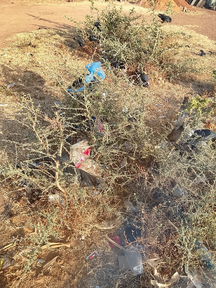 A dry, dusty landscape is marred by scattered trash amongst sparse, thorny vegetation