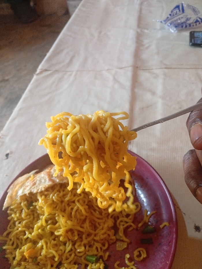 A red plate is piled high with cooked noodles, some mixed with green vegetables. A fried egg rests on top of the noodles. A fork holds a tangled portion of the yellow noodles. The food sits on a light-colored, textured tablecloth. A partially visible hand holds the fork. A small cellophane wrapper and a mobile phone are also visible in the background.