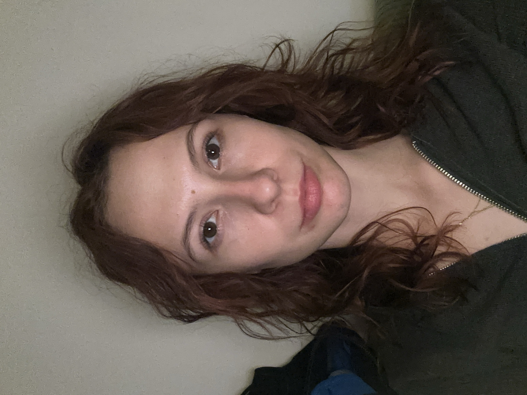 A young adult female is depicted in a head-and-shoulders portrait, centered in the frame. She has wavy reddish-brown hair extending past her shoulders, dark eyes, and a small dark mole visible on her forehead above her right eyebrow. Her expression is neutral, and she looks directly forward. She wears a dark green or olive-colored hooded sweatshirt with a silver zipper that is partially unzipped, revealing a thin gold-colored chain necklace with a small pendant. The background consists of a plain, light-colored wall. A dark blue object is partially visible on the far left, behind her left shoulder. The scene is indoors. No specific visual identifiers are present to determine a precise location within the city of Novi Sad, Serbia.