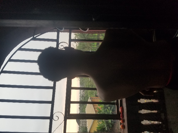 A silhouetted individual stands before a window with a black iron grill. The person's back and the side of their head are visible. Outside the window, a view of greenery and rooftops is present. Below the window, on what seems like a balcony ledge, are small, round objects, potentially fruit. The lighting is dim, emphasizing the contrast between the dark figure and the brighter view outside.