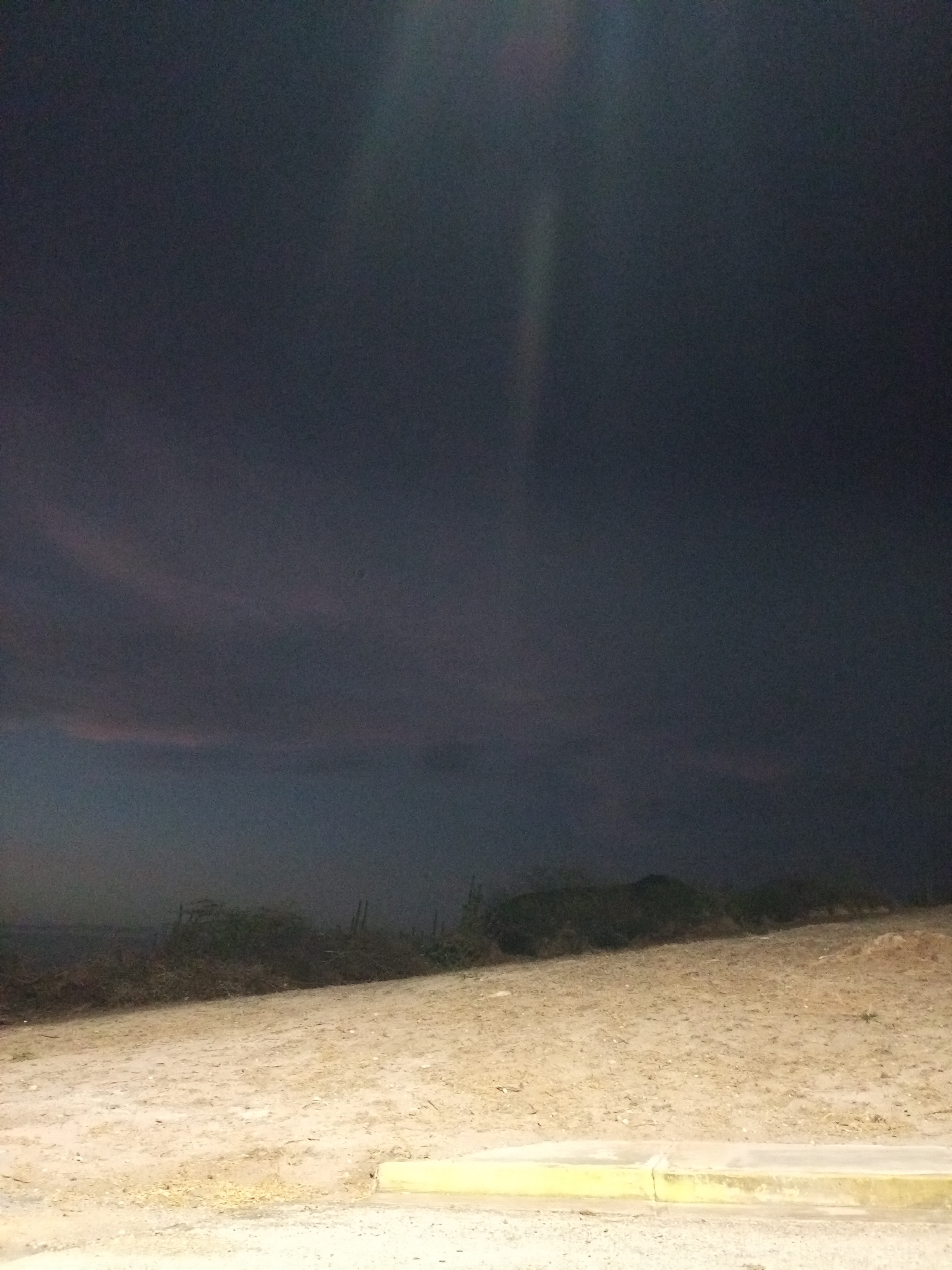 The image depicts a dark, possibly night, scene in or near Juan Griego, Venezuela. The foreground features a sandy or dirt ground surface, possibly a road or pathway, with a yellow curb. In the midground, there are shrubs or low vegetation. The background shows a dark and ominous sky, possibly with storm clouds. There is a faint, vertical streak of light in the sky.