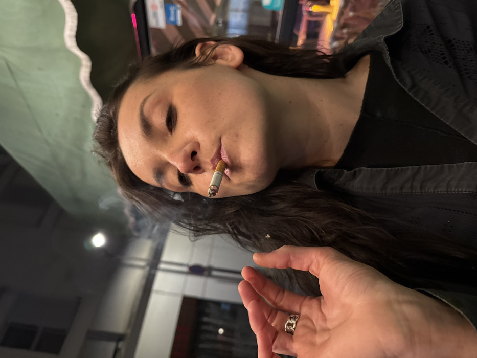 A woman with long, dark hair holds a lit cigarette to her lips. Smoke wafts into the air. She wears a dark collared shirt. Her hand is outstretched with a silver ring on her finger. The scene appears to be lit by indoor lighting at night, with hints of blurred lights in the background. The image is rotated, placing the woman's head on the left and her hand on the right.
