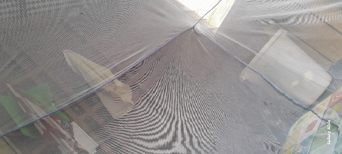 close-up of a mosquito net hanging inside a dwelling, likely in Soso, Solomon Islands, based on the provided coordinates. The net is made of fine, white mesh material and is partially covering a wooden floor with a distinctive patterned texture. In the foreground, a white plastic container is visible, partially obscured by the net. The net has a blue trim along the edges, and the image is taken from a low angle, looking upwards. The net is suspended from a wooden frame, likely a window or door frame. The image is taken in daylight, suggesting the scene is outside or in a well-lit room. The lighting is soft and diffused, creating a slightly blurred effect. There are no people or other animals visible in the image, and no actions or interactions are taking place. The image is taken from a stable, handheld position and captures a still moment in time.