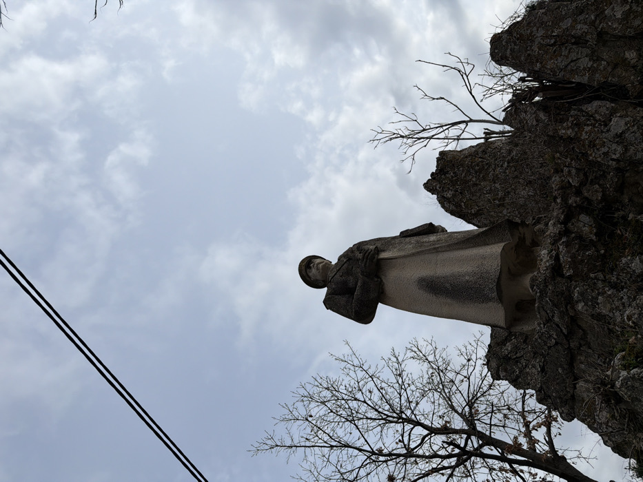 A low-angle, exterior photograph depicts a full-body statue, identified as General Mikhail Skobelev, situated atop a dark, rugged rock formation within Skobelev Park in Pleven, Bulgaria. The statue, composed of light-colored, textured stone, portrays a male figure with a prominent mustache, dressed in a military greatcoat and a peaked cap. The figure's left arm is bent at the elbow, with the hand positioned over the abdomen, while the right arm is also bent, with the hand held slightly forward. The statue faces slightly towards the viewer's right. The rocky base is dark and irregular, suggesting a natural or sculpted outcrop. Bare deciduous trees with dark, gnarled branches are visible on both sides of the statue; a more substantial tree occupies the left foreground, while sparser branches are present on the right. The sky is overcast with diffused, light grey clouds. Two parallel, dark utility lines traverse diagonally across the upper left quadrant of the frame. The scene is illuminated by diffused natural light, consistent with an overcast day.