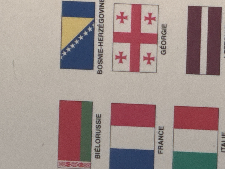 This image captures a section of a printed document, likely a flag chart, observed in Schiltigheim, France. The document features national flags with their names in French against an off-white background. Six flags are visible, organized in three rows of two. At the top left, the flag of Belarus, characterized by a red horizontal stripe over a green stripe, with a vertical white stripe containing a traditional red ornamental pattern along the hoist, is labeled "BIÉLORUSSIE". To its right, the flag of Bosnia and Herzegovina, consisting of a blue field with a yellow triangle extending from the hoist to the fly, bordered by a line of nine white five-pointed stars (seven full, two partial), is labeled "BOSNIE-HERZÉGOVINE". In the middle row, on the left, the flag of France, a vertical tricolor of blue, white, and red stripes, is labeled "FRANCE". To its right, the flag of Georgia, a white field with a large red St. George's cross extending to the edges and four smaller red Bolnisi crosses in each quadrant, is labeled "GÉORGIE". Partially visible at the bottom left is the flag of Italy, a vertical tricolor of green, white, and red stripes, with the label "ITALIE" mostly visible. Partially visible at the bottom right is the flag of Latvia, composed of two horizontal maroon stripes separated by a thinner white horizontal stripe, with the label "LETTONIE" mostly visible. The document surface appears slightly textured, with minor speckles or dust visible. No individuals, actions, or direct interactions are depicted within the image frame.