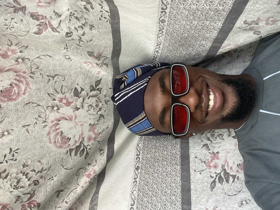 A person wearing a striped beanie and red-tinted sunglasses smiles broadly while lying on a patterned bedspread. The bedspread has floral prints on the left and right, separated by striped panels. The individual is dark-skinned and has a full beard. They are wearing a grey top, and their head is slightly tilted to the right. The background features a cream and grey color scheme with floral motifs.