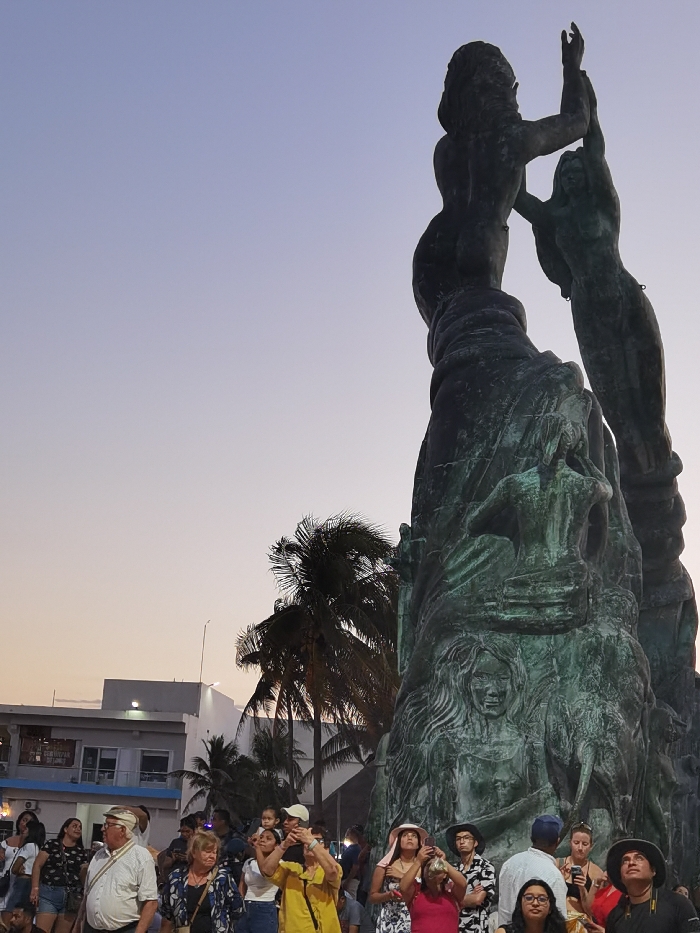 The scene shows a large bronze statue of two women, located at the Parque Benito Juárez in Cozumel, Mexico (latitude: 20