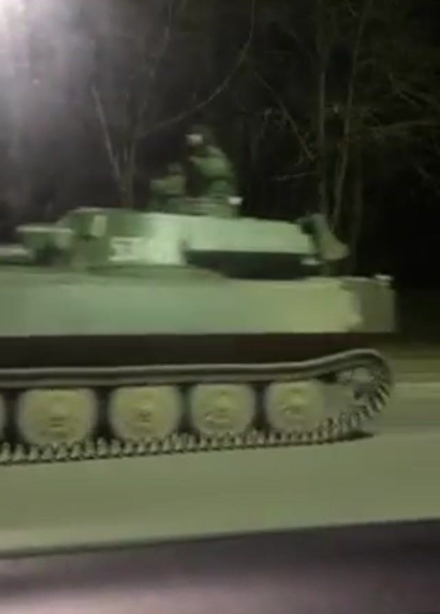 From inside a vehicle, a tank is observed driving on a road. The tank is olive green and has visible tracks. A person appears to be on top of the tank. The road is paved and there are trees without leaves lining the roadside. It is night time. A street light is visible. The vehicle filming passes the tank.