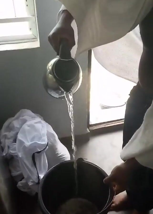 A man in a partially open white towel, black pants, and barefoot pours water from a chrome teapot into a dark bucket. He looks directly at the camera momentarily, then back at the bucket. He is standing indoors, next to a window with white blinds. Next to the window is a washing machine with a pile of white clothes on top. Behind him, there is a door. The floor is tiled.