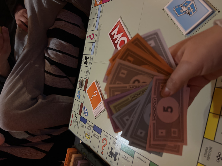 The image captures an indoor scene within the Gerakas Municipal Unit, Greece, depicting a board game of Monopoly in progress