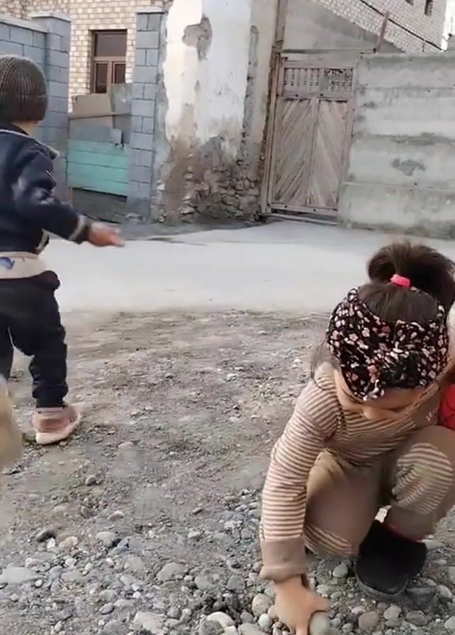 A young girl with dark hair in a bun adorned with a floral headband is crouched on a gravelly ground, picking up stones. She is wearing a striped beige top and matching pants, and black shoes. She cradles a red ball with a spider web design in her left arm. A boy in a brown knit cap is partially visible to the left. The background includes a brick building, a weathered white wall with a gate, and a street. The girl looks up and smiles at the camera.