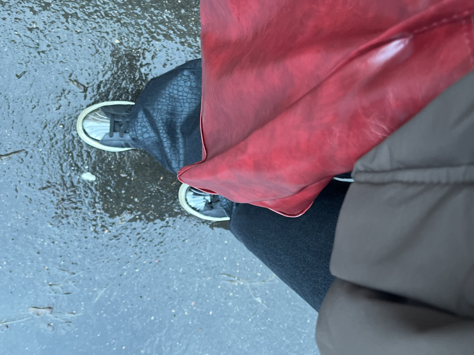 An overhead, first-person perspective photograph depicts the lower body of an individual standing on a wet, dark asphalt or concrete surface. The location is specified as the city of Minsk, Belarus. The subject wears black lace-up low-top sneakers with light-colored soles and toe caps. The left shoe is mostly visible, while the right shoe is partially obscured. Black, form-fitting pants or leggings cover both legs. Over the right leg area, a distinct black garment or section of clothing with a textured, possibly scaled or honeycomb pattern, is visible. A large, deep red or reddish-brown bag, appearing to be made of leather or faux leather with a slightly textured finish, is held or rests against the subject's left side, partially covering the upper left leg and lower torso. The bottom left corner shows a portion of a brown or olive-brown puffer-style coat or jacket. The ground surface is dark, visibly wet and reflective, indicating recent precipitation, with small puddles and scattered debris.