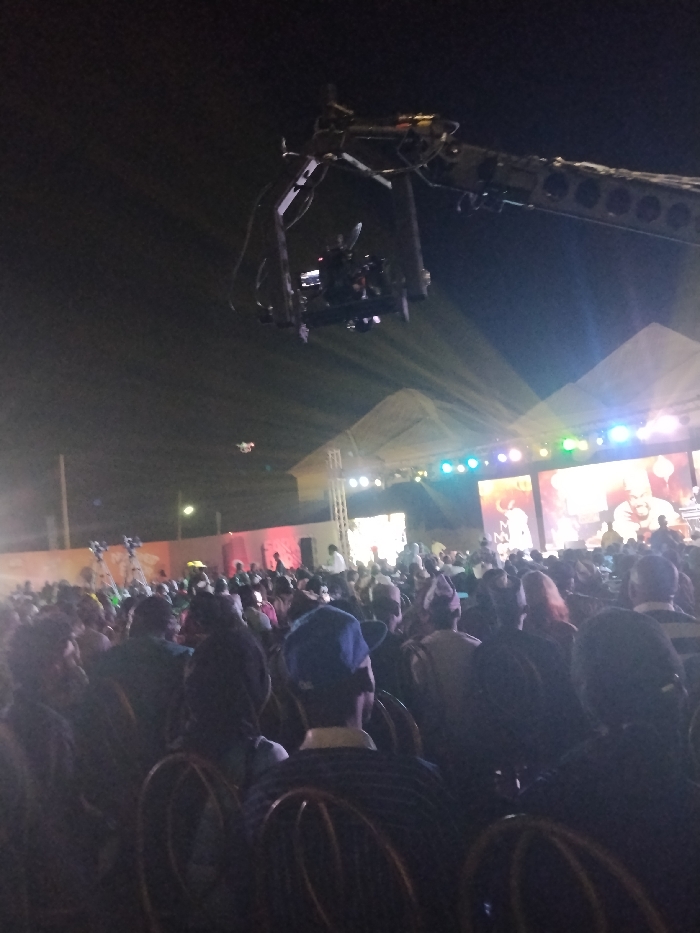 This image depicts a large-scale outdoor event at night in Fagge D2, Nigeria. The scene is illuminated by numerous artificial lights emanating from a brightly lit stage in the background. In the foreground and midground, a substantial crowd of individuals is seated, predominantly viewed from behind, occupying brown metal-framed chairs with curved backs. They are oriented towards the stage, suggesting they are an audience. Visible clothing includes various dark garments and at least one person wearing a blue baseball cap and another with a traditional cap. Overhead, a prominent camera crane (jib) is positioned in the upper center-left, with a professional video camera system mounted at its end, aimed towards the stage area. Further in the background, a small, illuminated object resembling a drone is visible in flight. The stage area features multiple bright, multi-colored stage lights (blue, green, yellow, white, pink) mounted on truss structures. Two large video screens or LED walls are prominent on the stage, displaying images of individuals, one showing a person from the chest up, and the other a full-body shot. White tent-like structures are visible behind and over parts of the stage and possibly audience sections. On the far left of the midground, additional camera equipment on tripods is visible.