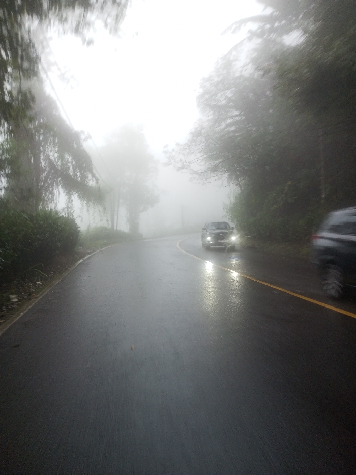 A winding road disappears into dense fog, flanked by verdant foliage on either side. The wet asphalt reflects light, indicating recent rain. Two cars are visible: one approaches with headlights on, cutting through the mist, while the other is partially obscured on the right side of the frame, closer to the viewer. A yellow line runs along the road's edge, guiding traffic through the reduced visibility. The overall atmosphere is eerie and atmospheric due to the pervasive fog.