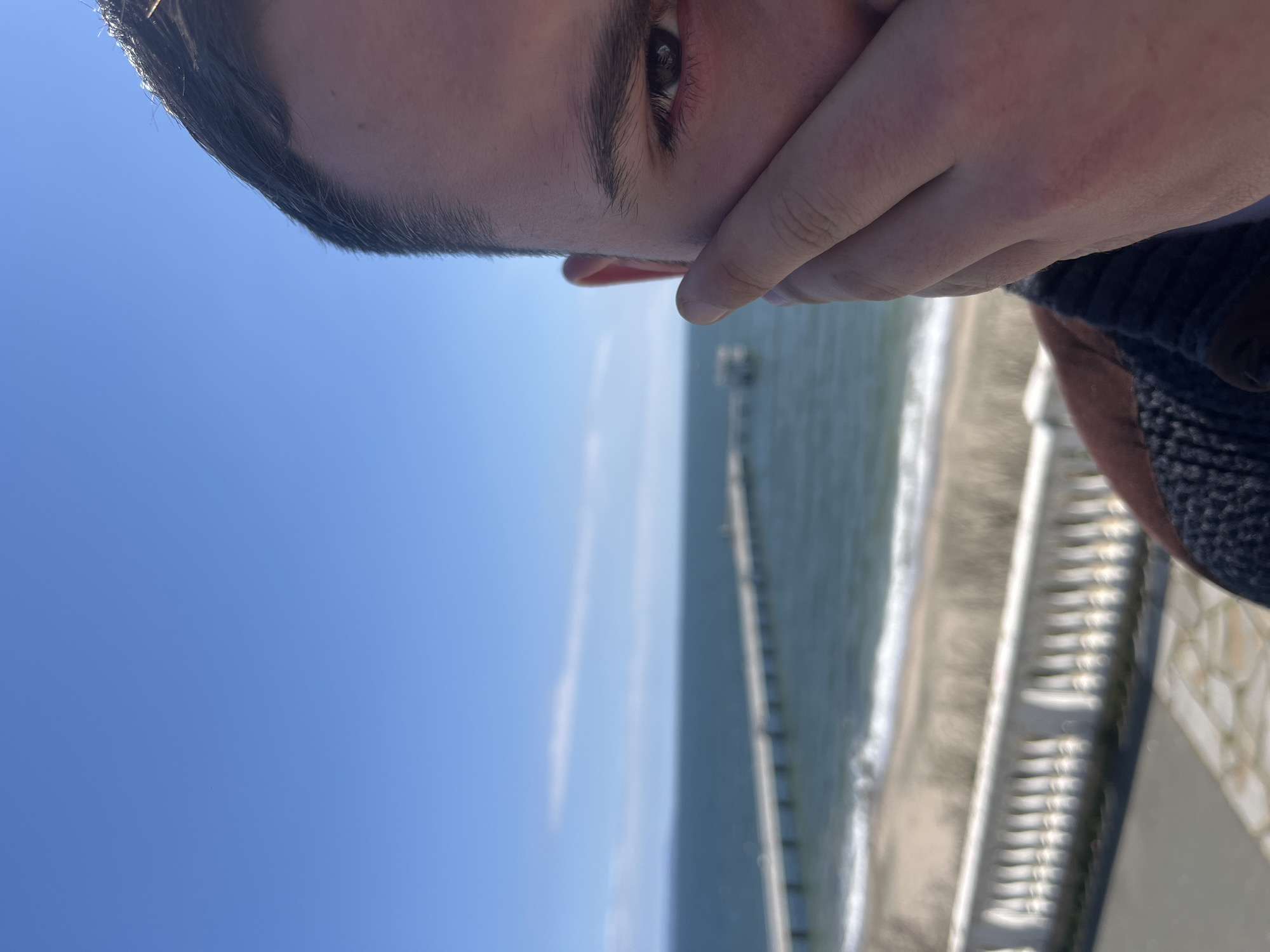 partial view of a person's face with a hand covering the lower part. The person has short, dark hair and is looking towards the camera. In the background, there is a seaside scene with the sky, a beach, and the sea. There is a pier extending into the sea. The photo was most likely taken in Burgas, Bulgaria. There are stairs, a sidewalk, and a partial view of clothing visible as well.