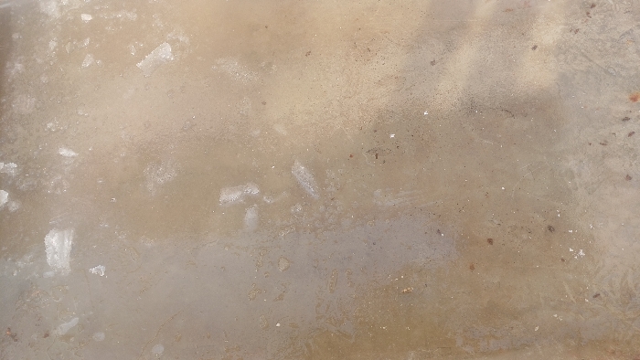 textured, dirty surface. Predominantly beige and brown, the surface features mottled patches and a scattering of darker specks. Various white marks, some appearing as smears or residue, are visible. The texture appears worn, with some areas appearing smoother than others. The overall impression is of a soiled or weathered material.