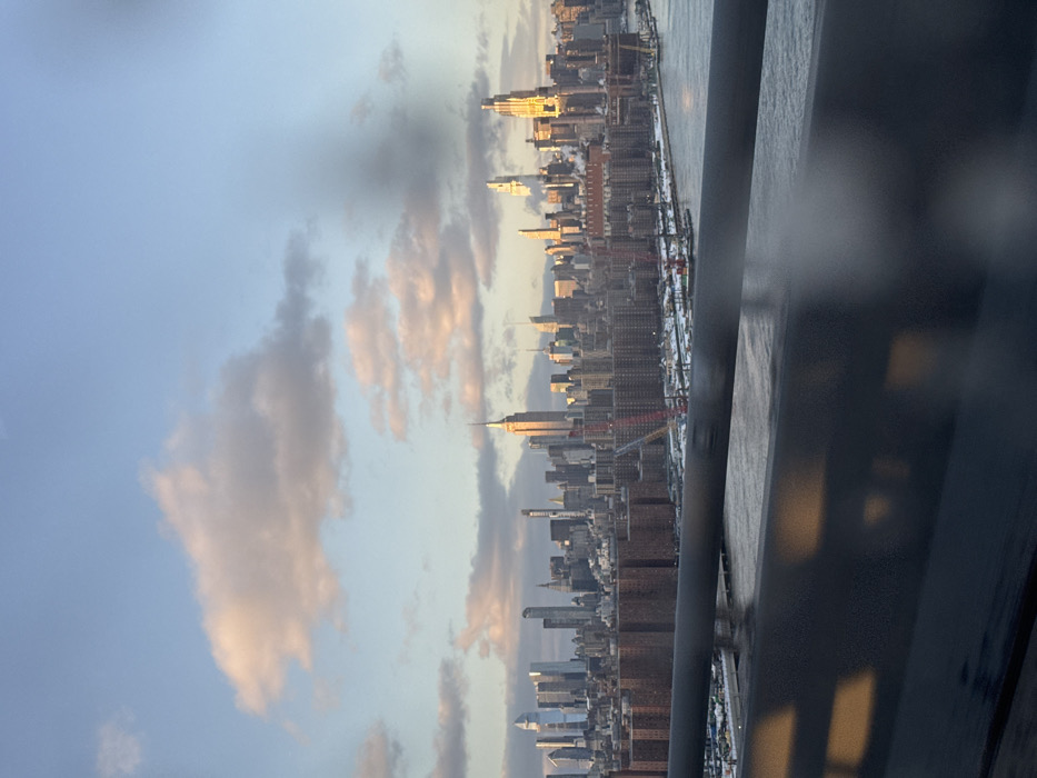 A city skyline is visible against a sky with clouds tinged orange. The Empire State Building is identifiable among the other buildings. A body of water is located alongside the city. A structural element, potentially a part of a window or balcony, appears in the foreground, partially obscuring the view. The photograph's orientation is vertical, with the city scene running horizontally across the top portion.