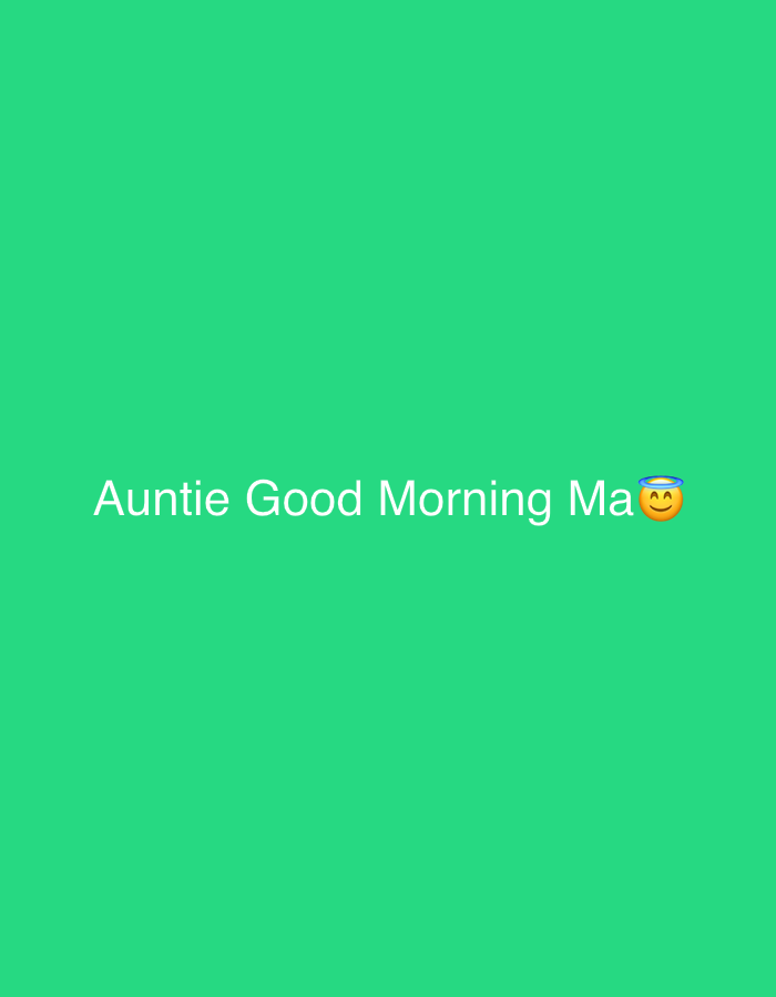 The image displays a uniform emerald green background. Centered horizontally on this background is white text reading 'Auntie Good Morning Ma'. Immediately adjacent to the text, on its right, is a yellow smiling face emoji depicted with a halo. No other subjects, objects, or physical environment are visible. The location is Narayi, Nigeria.