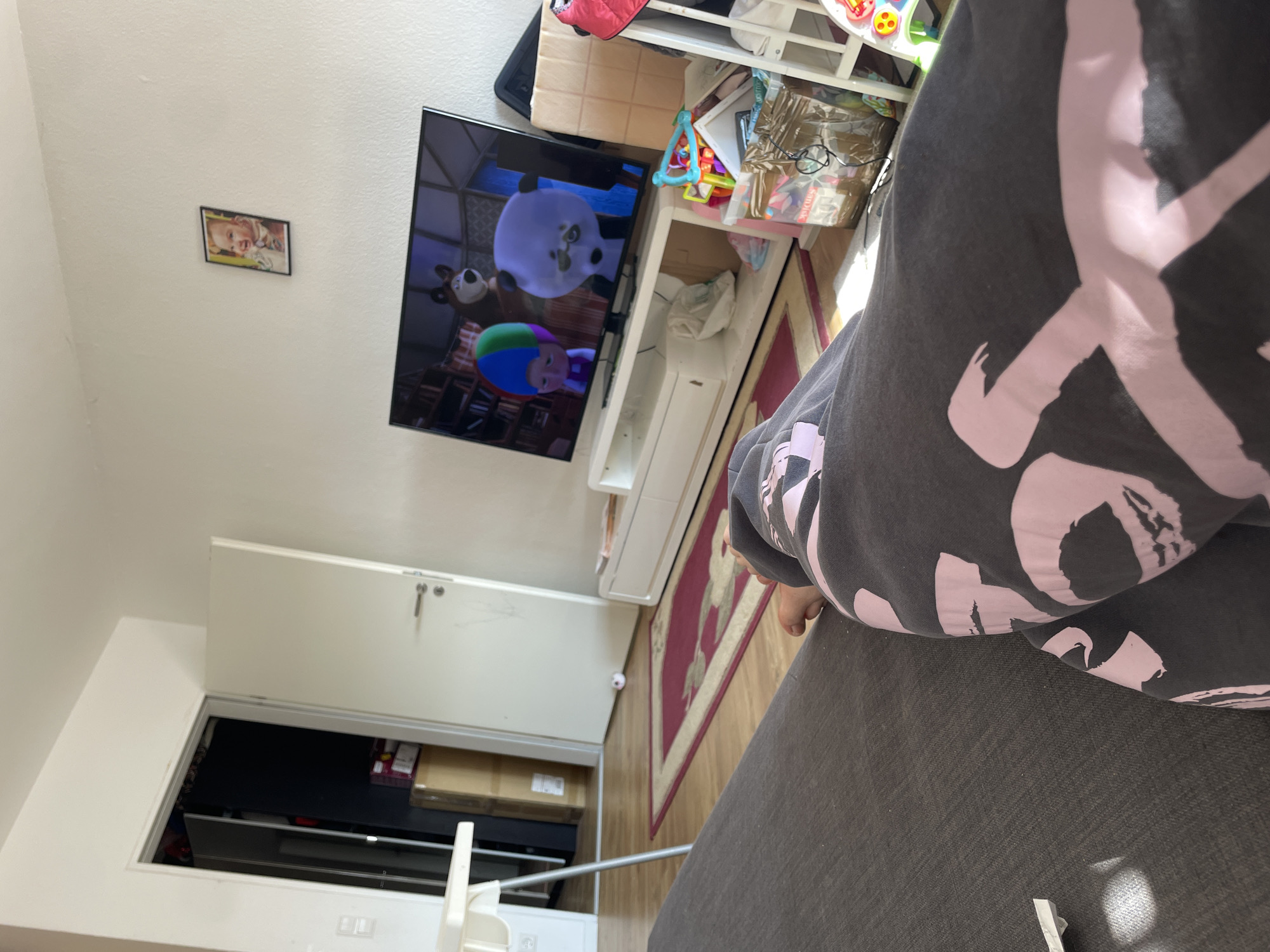The image depicts an interior domestic scene in Senden, Germany, observed from a low, first-person perspective. In the immediate foreground, the lower extremities of a seated individual are visible, clad in dark grey athletic trousers patterned with large, light pink abstract shapes; a bare foot is partially visible. The subject is positioned on a dark grey fabric sofa, with a small white rectangular object resting on the sofa to the left. The flooring consists of light-toned wooden laminate, partially covered by a rectangular rug featuring a red border and a central beige/cream motif. A large, black flat-screen television dominates the central midground, displaying an animated children's program featuring a character with a colorful hat, a brown bear, and a purple panda-like figure. The television rests on a white, multi-compartment media console. Adjacent to the console on the right, a white baby cot frame is partially obscured, containing various children's toys and miscellaneous items in plastic containers and bags, alongside cardboard boxes. To the left, a white plastic baby high chair with metallic legs is positioned. An open white door reveals an adjacent room or closet, containing dark shelving units and stacked cardboard boxes. A framed portrait of a smiling infant is mounted on the plain white wall above the television. Natural illumination enters the space from an unseen source to the right, casting a bright spot on the floor.