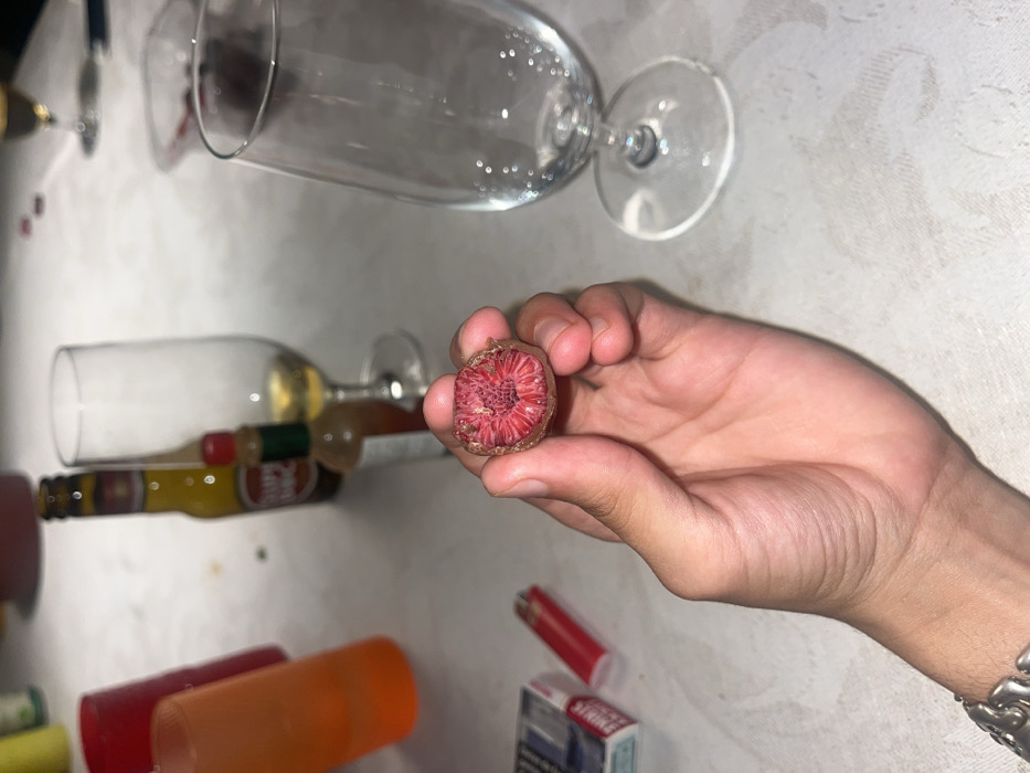 The image depicts an indoor scene in Aldoar, Foz do Douro e Nevogilde, Portugal, focusing on a human left hand holding a partially consumed fruit. The hand, exhibiting light skin tone and a silver-toned bracelet on the wrist, presents a deep red, textured fruit, possibly a lychee or rambutan, cut open to reveal its segmented, fibrous interior. The fruit is held with the thumb and fingers, presenting its cross-section towards the viewer. The foreground and midground consist of a light-colored, textured surface, likely a tablecloth. Scattered across this surface are various items: a white and blue cigarette pack (Marlboro brand visible), a red disposable lighter, two opaque plastic cups (one orange, one red), an upright yellow beer bottle (Super Bock brand prominently displayed), a small clear glass bottle with a red cap (resembling Tabasco sauce), and multiple stemmed glasses. One large stemmed glass is empty and positioned prominently to the right of the hand. Another stemmed glass, partially obscured in the background, contains a small amount of amber liquid. Further in the background, out of focus, are small red objects, possibly bottle caps or berries, and another blurred stemmed glass. The lighting appears artificial, suggesting an evening or indoor setting without direct natural light.