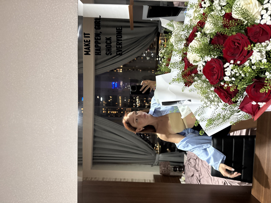An indoor scene in South Jakarta, Indonesia, is captured via a mirror selfie at night. The central subject is a woman with reddish-brown hair, wearing a beige bandeau top beneath an open light-blue button-down shirt and dark bottoms. She is reflected holding a black smartphone in her right hand to take the photo, while her left hand, adorned with a ring, rests on a black office-style chair. Positioned prominently in the foreground of the reflection is a large floral bouquet composed of red and white roses, baby's breath, and green foliage, wrapped in white paper with a partially visible "ALS" logo. The background reflection shows a bedroom setting: a bed with purple bedding, a nightstand with a lamp, and dark grey curtains framing a window overlooking an illuminated city skyline at night. Adhesive black lettering on the mirror above the woman's reflection spells out "MAKE IT HAPPEN, GIRL SHOCK EVERYONE." The room is brightly lit, contrasting with the exterior darkness.