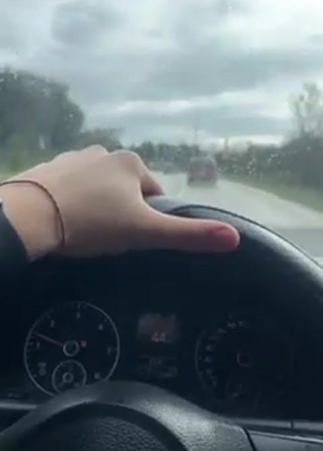 point of view of a person driving a car in the rain. A hand is visible on the steering wheel, and the dashboard with gauges is in focus. The windshield wipers are active, and the road ahead is wet and slightly winding. Another car is visible in the distance. The sky is overcast, suggesting a gloomy and wet day. A warning sign and some buildings can be seen through the windshield, indicating the car is on a road with some structures nearby.