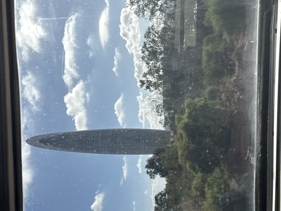 The image displays the Mohammed VI Tower, a prominent skyscraper located in Salé, Morocco. The tower, a tall, slender, ovoid structure with a light grey paneled facade, occupies the central and upper portions of the frame, tapering to a pointed apex that features a vertical opening. It rises above a dense, irregular band of mixed green and bare trees that constitute the midground. The background is a blue sky populated with scattered white cumulus clouds; a faint white linear streak is visible in the upper right quadrant. The entire scene is observed through a glass pane, characterized by numerous small, diffuse white spots consistent with dust or water residue, and framed by dark horizontal bars at the top and bottom, indicative of a window frame or vehicle interior. The scene is illuminated by natural daylight. No individuals or explicit actions are discernible.