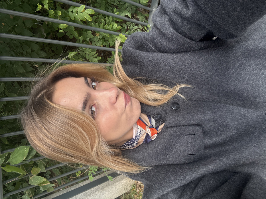 A young adult female is captured in a close-up selfie in Villeurbanne, France. Her light brown hair with blonde highlights frames a face with brown eyes, prominent eyebrows, and slightly pursed lips. She wears a dark gray, textured coat featuring visible black buttons and a buttoned flap on the upper left chest. A multicolored scarf, patterned in orange, white, navy blue, and beige, is tied around her neck. The background consists of a gray metal railing with vertical bars, behind which dense green foliage is visible.