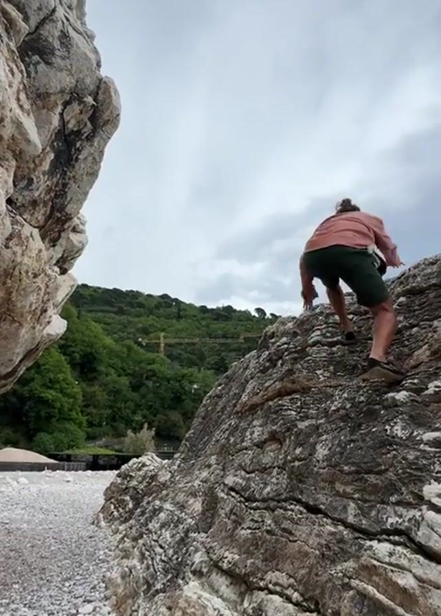 A man with long hair wearing a pink shirt and green shorts carefully climbs on large rocks. He starts with one foot on one rock and the other on another, then pulls himself up onto the second rock, using his hands for balance. He pauses for a moment, looking out at the view, then turns and smiles at the camera. The rocks are located on a beach with small stones and a backdrop of green hills and a cloudy sky. A construction crane is visible in the distance.