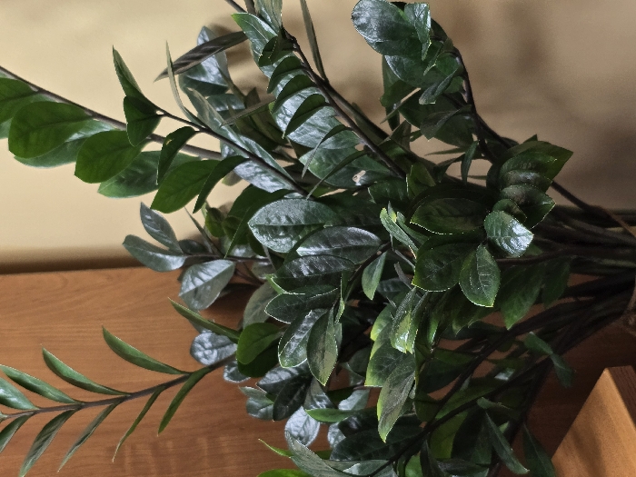 A lush arrangement of dark green, glossy-leaved stems fills the frame. Leaves are oval and pointed, attached to dark brown stems. The arrangement is dense, with leaves overlapping. In the lower part of the image, there is a wooden surface and light yellow wall. The light reflects on the surface of the leaves.