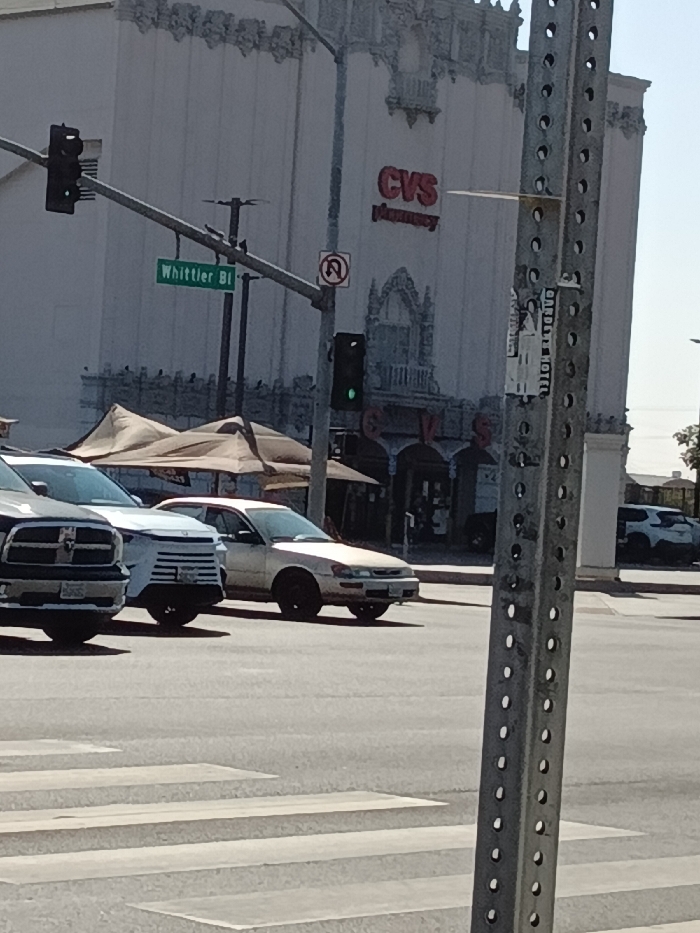 The image depicts a daytime street scene at an intersection in East Los Angeles, United States, specifically at Whittier Boulevard, as indicated by a green street sign reading "Whittler Bl". In the foreground, a perforated metallic street signpost occupies the right side of the frame. Below it, a white-striped pedestrian crosswalk is visible on the asphalt road surface. Three vehicles are positioned on the road, facing generally right-to-left: to the far left, the front grille of a dark-colored pickup truck is partially visible; next to it, a white SUV or minivan; and centrally, a light-colored, older-model sedan with dark wheels. The midground features a street intersection with a traffic light showing a green signal, another obscured traffic light, and associated utility poles and lines. A "No U-Turn" sign is also present. On the right side of the street, two large, tan-colored pop-up canopy tents are erected, positioned in front of a building entrance. In the background, a large, light-colored building with elaborate architectural detailing, resembling a historical theater, serves as a prominent landmark. The red lettering "CVS Pharmacy" is affixed to its facade. The sky above is clear and bright. To the far right, a white SUV is partially visible in the distance.