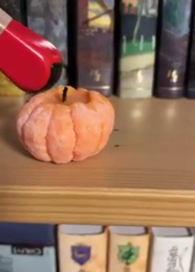 A red lighter ignites a small, orange, pumpkin-shaped candle. The lit candle sits on a wooden shelf in front of a row of books. The flame of the candle is bright orange and dances as it burns. The books behind the candle are ornate, with colorful covers. A few books beneath the pumpkin are visible, featuring coats of arms.