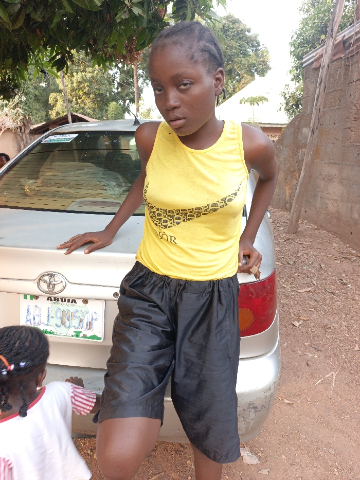 The image depicts an outdoor scene in Akwanga, Nigeria. The ground consists of reddish-brown dirt. A young female, the primary subject, stands centrally, facing the camera. She has braided hair, dark skin, and wears a yellow sleeveless tank top with a black graphic design, paired with black knee-length shorts. Her right hand rests on the trunk of a silver Toyota sedan. Her left hand is by her side, with fingers slightly cupped. A younger child, with braided hair and wearing a white top with red-striped sleeves, is partially visible in the lower-left foreground, facing away from the camera, positioned near the car's rear bumper. The sedan features a Nigerian license plate displaying "ABUJA ABJ-9050 FG CENTER OF EXCELLENCE". In the background, to the left, dense green foliage and obscured structures are visible. To the right, a weathered concrete or brick wall stands with a wooden beam or ladder leaning against it. A faint individual is partially discernible behind the car's rear window on the left. Green tree leaves overhang the top-left of the frame.