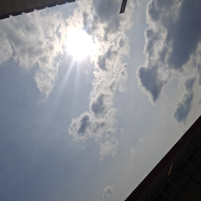 The image captures a sky view, presumably within the city of Plovdiv, Bulgaria, although no specific city landmarks are discernible. The sun, emitting prominent starburst rays, is intensely bright in the upper right quadrant of the frame, partially obscured by scattered cumuliform clouds. These clouds range in tone from light to dark grey and are distributed across a light blue sky. In the lower-left corner, the dark, upward-sloping roofline of a building, edged in red, is visible. Below the roof, a dark building facade presents several horizontal architectural elements and a single linear light fixture. Along the extreme right edge, a narrow, vertical portion of a light-colored building wall is present, from which a dark, rectangular object protrudes horizontally. No people, animals, or specific actions are depicted in the scene.