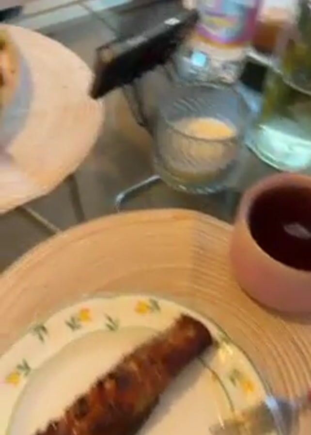 dining table set for a meal. Initially, a plate containing a cooked piece of meat resembling a pork tenderloin is visible, along with a fork and a pink mug of tea. Other items on the table include a bottle of water, a vase with yellow flowers, and a phone in a stand. The camera moves to show a child in a grey camouflage outfit seated at the table, eating sliced meat from a plate. The plate also contains a bone. A person off-camera uses tongs to place sliced meat on the child's plate. The camera returns to the first plate with the whole piece of meat.