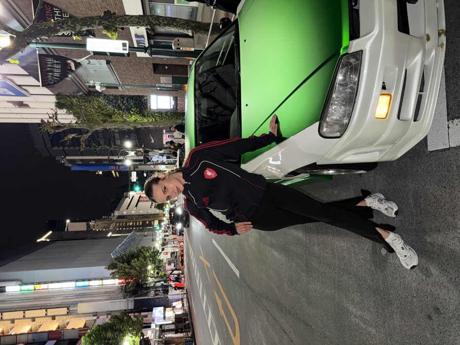 A nighttime street scene in Shibuya, Tokyo, Japan, depicts a woman posing next to a modified car